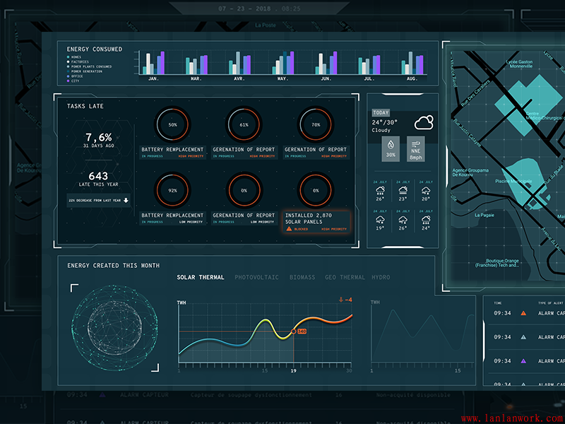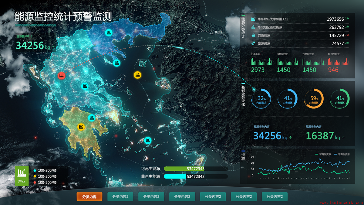 大屏可視化界面設(shè)計可謂是當今行業(yè)、企業(yè)發(fā)展的見證,生動直觀地再現(xiàn)了行業(yè)、企業(yè)的全貌。不僅作為展示,方便了解、監(jiān)督;同時可以作為一個有效的管理平臺,帶來效益。大屏界面面向范圍廣,協(xié)同性好,易于被采用。下面幾個大屏的界面設(shè)計,沉穩(wěn)的背景上,加上亮色作為點綴和強調(diào)。既不失其風格,又富有靈動性。