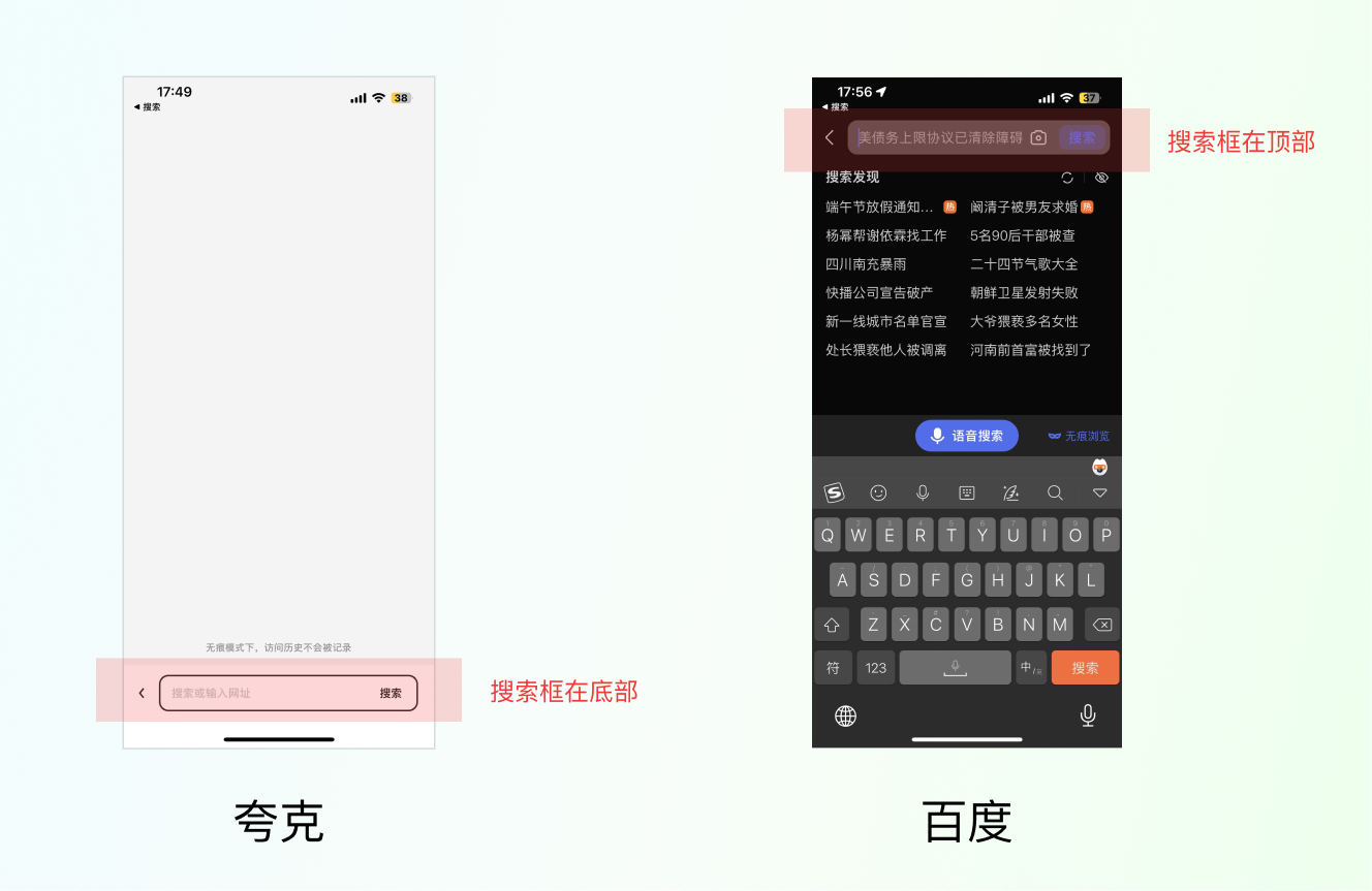 因?yàn)榭淇讼胪品瓊鹘y(tǒng)的瀏覽器,想打造一款更年輕更好用的瀏覽器,把搜索框放到下面也是滿足他們的業(yè)務(wù)訴求,現(xiàn)在手機(jī)屏幕越來(lái)越大,搜索框放在下面手指操作更加方便。所以,一定要先去了解業(yè)務(wù)。