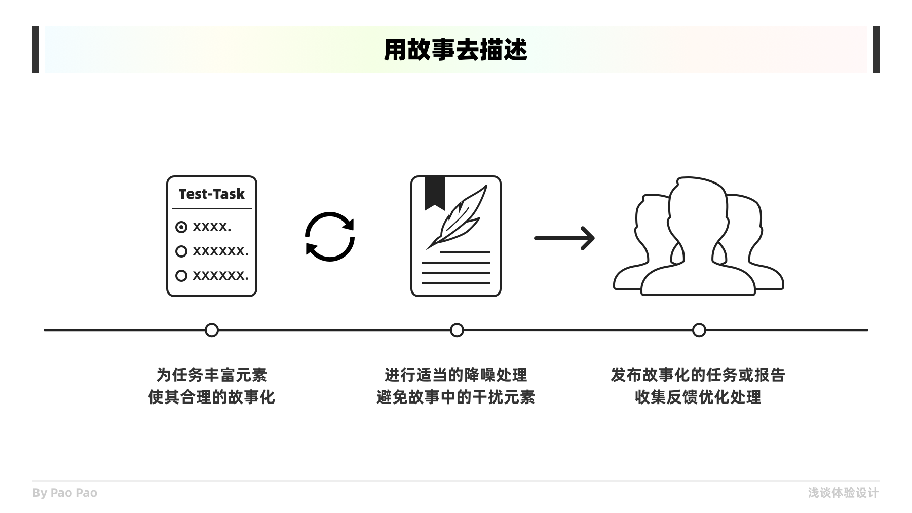 故事的元素通常會更豐富更有趣味,用故事敘事更能提升用戶的興趣和關(guān)注,這能便于構(gòu)建共情。因此當你發(fā)布測試任務(wù)或者撰寫研究報告時,都可以加入背景故事或用故事敘事,便于對象更容易理解和共情,你甚至可以用筆繪制故事版,像四格漫畫一般,因為用圖傳達概念或信息更容易讓人記住或回想起來,并且當你用這些方法時,自身也能加強理解。共情不是單向傳遞的,不要高估對方的理解能力,讓你的信息更簡單明了的傳遞也是重要的共情應(yīng)用!