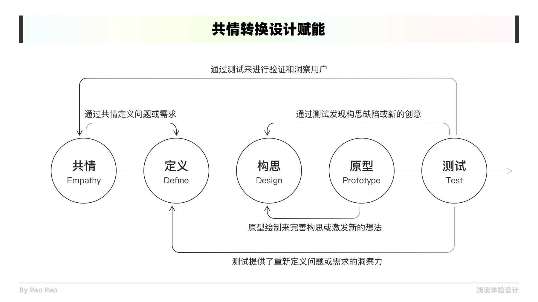 最后便是共情結(jié)果如何應(yīng)用到設(shè)計之中,將共情結(jié)果賦能到產(chǎn)品設(shè)計也是共情工作的價值所在。通常這套流程是共情->定義->構(gòu)思->原型->測試,在這個整個過程中隨時是可以返回到前面其他階段中反復(fù)打磨的,而共情作為一個起點也揭示了其重要性。我們一切的共情工作皆為了能夠優(yōu)化和解決產(chǎn)品的問題,使得產(chǎn)品體驗?zāi)軌蚋?,這是我們在體驗設(shè)計中不斷去共情的初衷。