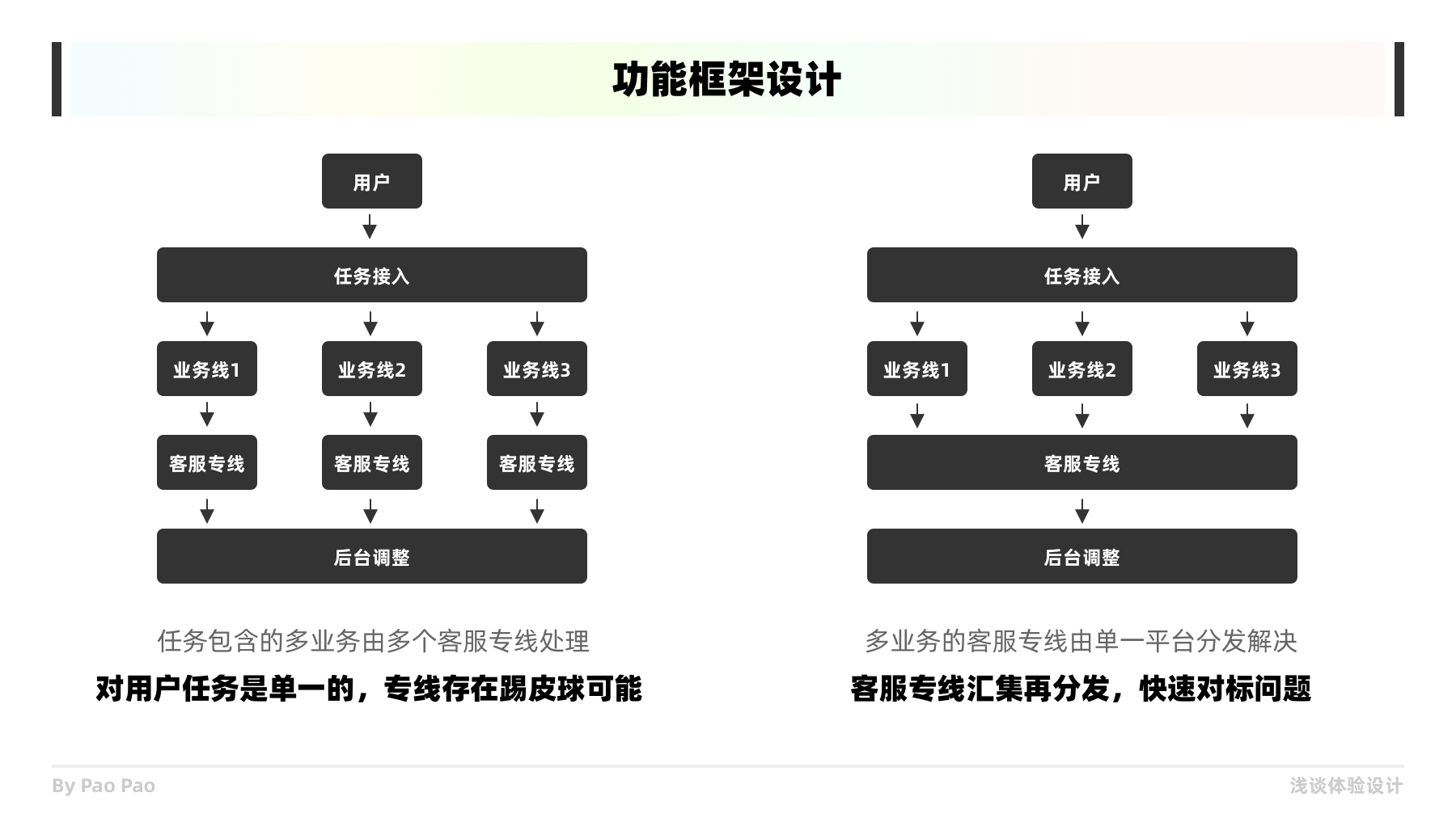 在構(gòu)建產(chǎn)品業(yè)務(wù)框架時,大多可能會出現(xiàn)以公司服務(wù)資源為中心的構(gòu)建方式,但同時這種由內(nèi)而外開發(fā)方式會為產(chǎn)品帶來更多的弊端(往往產(chǎn)品投入使用后,會出現(xiàn)超出預(yù)期的問題)。嘗試去站進用戶的鞋子里去,或者找來目標用戶甚至是相關(guān)的專家來做咨詢,減少研發(fā)迭代的彎路。
