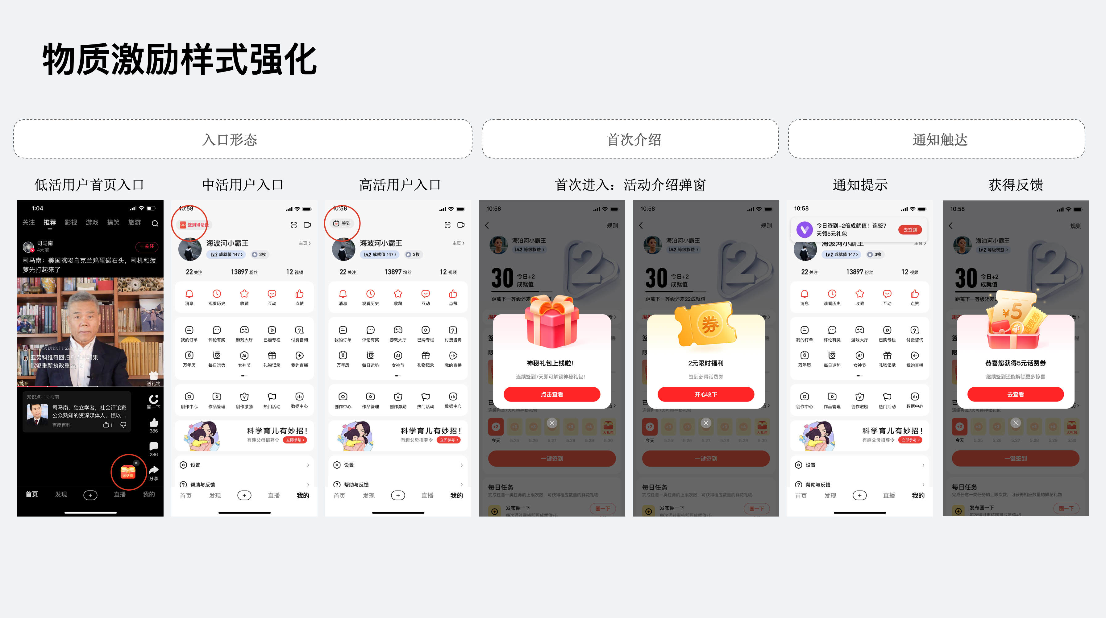 ?(2)物質(zhì)利益激勵(lì):等級(jí)體系的搭建形成了自然人群的劃分,對(duì)于低活人群、多年齡段能夠有針對(duì)性的進(jìn)行進(jìn)一步的個(gè)性化運(yùn)營(yíng),不同任務(wù)行為軌跡或活躍程度的人群個(gè)性化定制任務(wù)與現(xiàn)金激勵(lì),來(lái)達(dá)成對(duì)應(yīng)產(chǎn)品目標(biāo),讓其養(yǎng)成習(xí)慣,進(jìn)而持續(xù)使用好看視頻,轉(zhuǎn)化為忠誠(chéng)用戶。