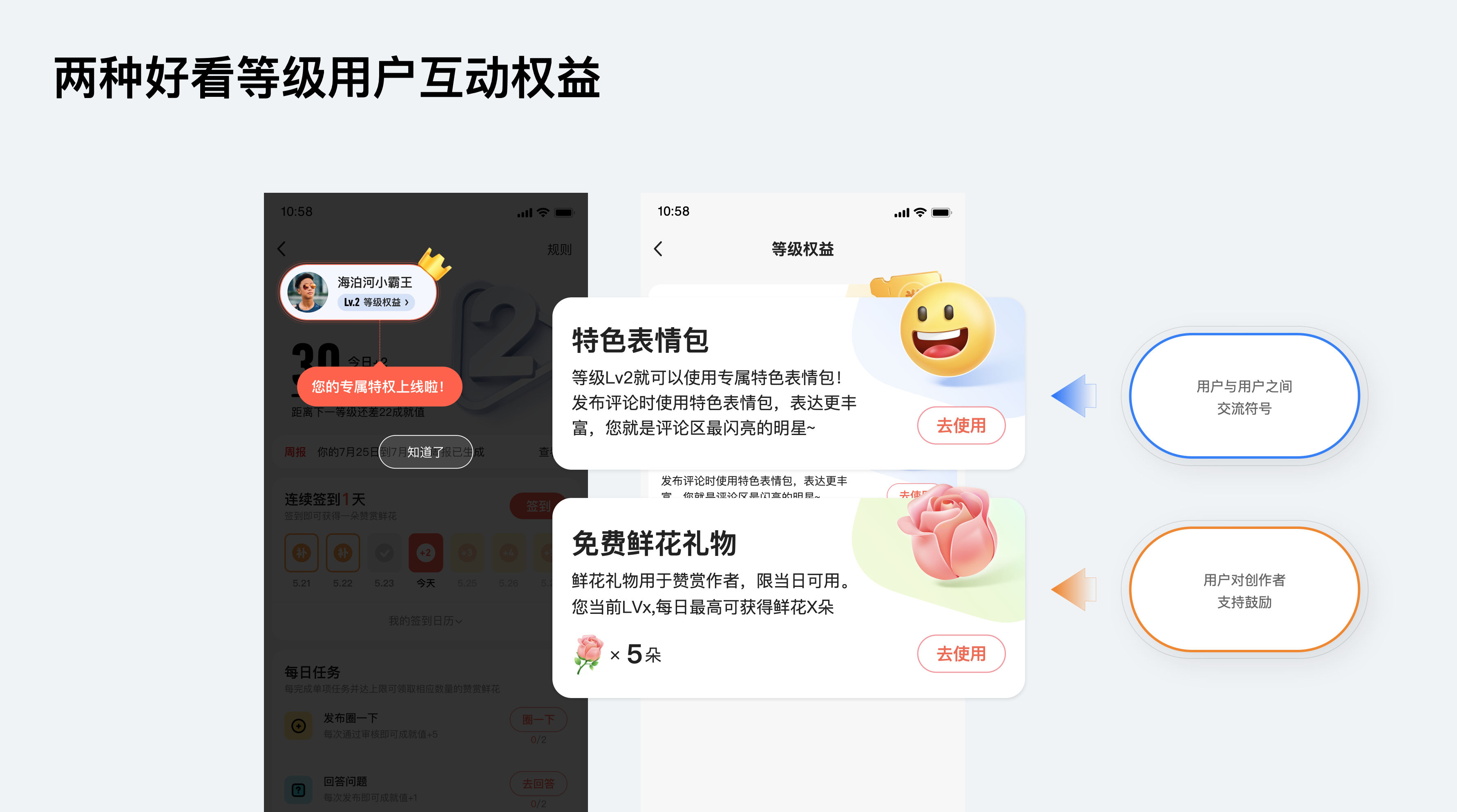 因此在精神激勵(lì)的虛擬權(quán)益上,好看平臺(tái)希望能夠打造一款有記憶點(diǎn)的互動(dòng)方式,一方面;用戶之間的主要互動(dòng)場(chǎng)景是評(píng)論區(qū),因此權(quán)益之一是打造符合好看人群特征的互動(dòng)表情,創(chuàng)造平臺(tái)特有的互動(dòng)語(yǔ)言來(lái)加強(qiáng)用戶交流;另一方面好看的內(nèi)容創(chuàng)作者一般為多平臺(tái)創(chuàng)作者,需要讓創(chuàng)作者在好看平臺(tái)上感受到用戶差異,激發(fā)創(chuàng)作動(dòng)力,因此也塑造了用戶等級(jí)下的另一個(gè)權(quán)益“鮮花禮物”。作者使用被打賞的鮮花可以進(jìn)行流量曝光的兌換,形成了一個(gè)用戶側(cè)互動(dòng)激勵(lì)與創(chuàng)作者側(cè)的良性互動(dòng)。