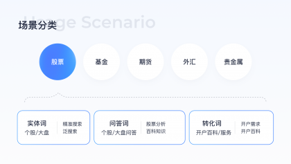 不同場景下用戶需求不同,設(shè)計解決方案會有差異,金融品類需求豐富包括股票/基金/期貨/外匯/貴金屬,需求類型包括實體需求/問答需求/轉(zhuǎn)化需求,需通過數(shù)據(jù)分析了解各類需求占比,可以作為后續(xù)優(yōu)化優(yōu)先級的判斷指標,經(jīng)過數(shù)據(jù)分析后得出結(jié)論股票品類需求及用戶占比遠高于其他品類,以股票品類舉例細化用戶需求,列舉搜索詞,便于后續(xù)進行線上問題走查挖掘設(shè)計機會點。