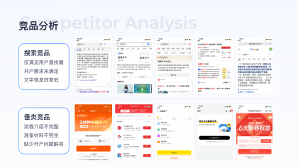 競品分析:搜索競品包括今日頭條、夸克、QQ瀏覽器、必應(yīng)、谷歌均以滿足用戶查找需求為主,信息以純文本形式展現(xiàn),消費成本較高,且未滿足用戶潛在的開戶需求,垂類競品開戶頁對流程、材料介紹均不完整、缺少完整的介紹及問題解答。