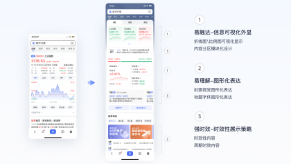 基于小白用戶經(jīng)驗少、金融垂類專業(yè)知識多晦澀難懂、數(shù)據(jù)復雜難理解的背景,制定易觸達、易理解2個策略,通過信息可視化外顯、圖表圖形化表達、關(guān)鍵信息外顯等方式降低用戶消費門檻,提高信息獲取效率,強時效是基于股票特有的盤前/盤中/盤后周期性交易特征擬定的,可通過此特征打造更加差異化的滿足。