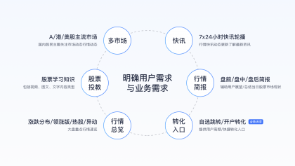 用戶需求:結(jié)合用戶高頻使用功能分析發(fā)現(xiàn)小白用戶、一般散戶、專業(yè)用戶均對行情功能有高頻率的使用需求,具體需求包括了解多市場、關(guān)鍵指數(shù)行情、了解最新快訊、重要行情動態(tài)、盤前/盤中/盤后簡報,再結(jié)合小白用戶占比高且對百科內(nèi)容有需求的現(xiàn)狀,知識科普信息也是相關(guān)待滿足需求。
