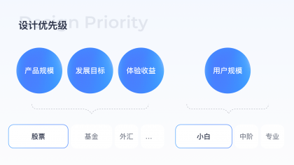 由于開發(fā)資源有限,不能一次做完所有產(chǎn)品設(shè)計優(yōu)化,因此需針對優(yōu)化內(nèi)容排布優(yōu)先級,對高優(yōu)場景進行優(yōu)化,這里的方法是結(jié)合用戶分類規(guī)模、產(chǎn)品品類規(guī)模、發(fā)展目標、體驗收益高低明確優(yōu)化優(yōu)先級,通過上述精細化分析得出結(jié)論股票場景用戶規(guī)模大,且小白用戶占比高,因此在股票場景下針對偏小白用戶高優(yōu)進行設(shè)計優(yōu)化。