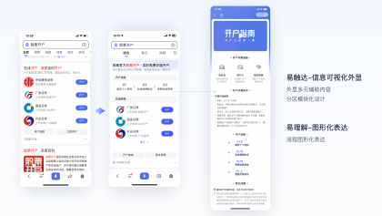 策略設(shè)計 :結(jié)合用戶需求優(yōu)先級對信息模塊進行分區(qū),可視化外顯優(yōu)先滿足開戶流程需求,再提供優(yōu)質(zhì)券商開戶入口,考慮到搜索結(jié)果頁卡片展示屏效,完整開戶指南配合在落地頁內(nèi)呈現(xiàn)。