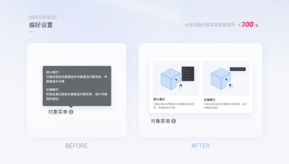 案例3:對象菜單鼠標(biāo)偏好設(shè)置在設(shè)計工具中,選擇對象喚出菜單,在酷家樂工具中可以設(shè)置為鼠標(biāo)左鍵點(diǎn)擊即喚出菜單(僅展示圖標(biāo)),也可以鼠標(biāo)右鍵喚出菜單(圖標(biāo)文字結(jié)合)。