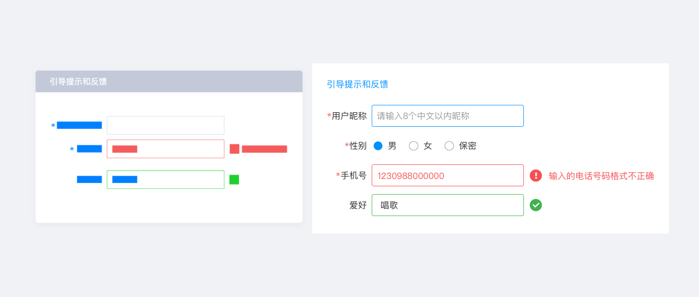 反饋提示發(fā)生在輸入中或輸入后,通過實(shí)時(shí)判斷信息字段是否符合規(guī)定,進(jìn)行提升反饋,減免錯(cuò)誤。