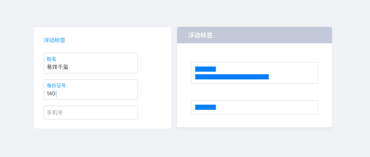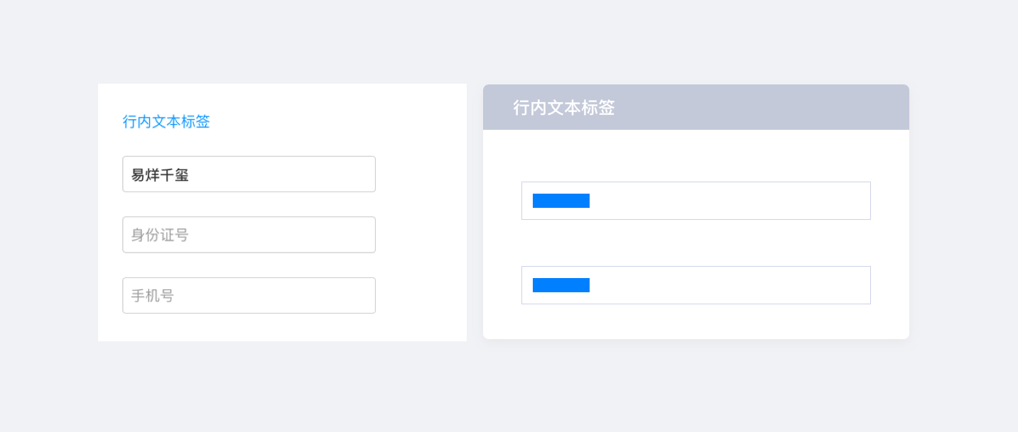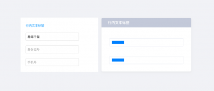 即標(biāo)簽位于輸入框內(nèi),擁有節(jié)約縱向和橫向空間的優(yōu)勢。行內(nèi)標(biāo)簽可分為齊行內(nèi)文本標(biāo)簽,行內(nèi)圖標(biāo)標(biāo)簽,浮動(dòng)標(biāo)簽