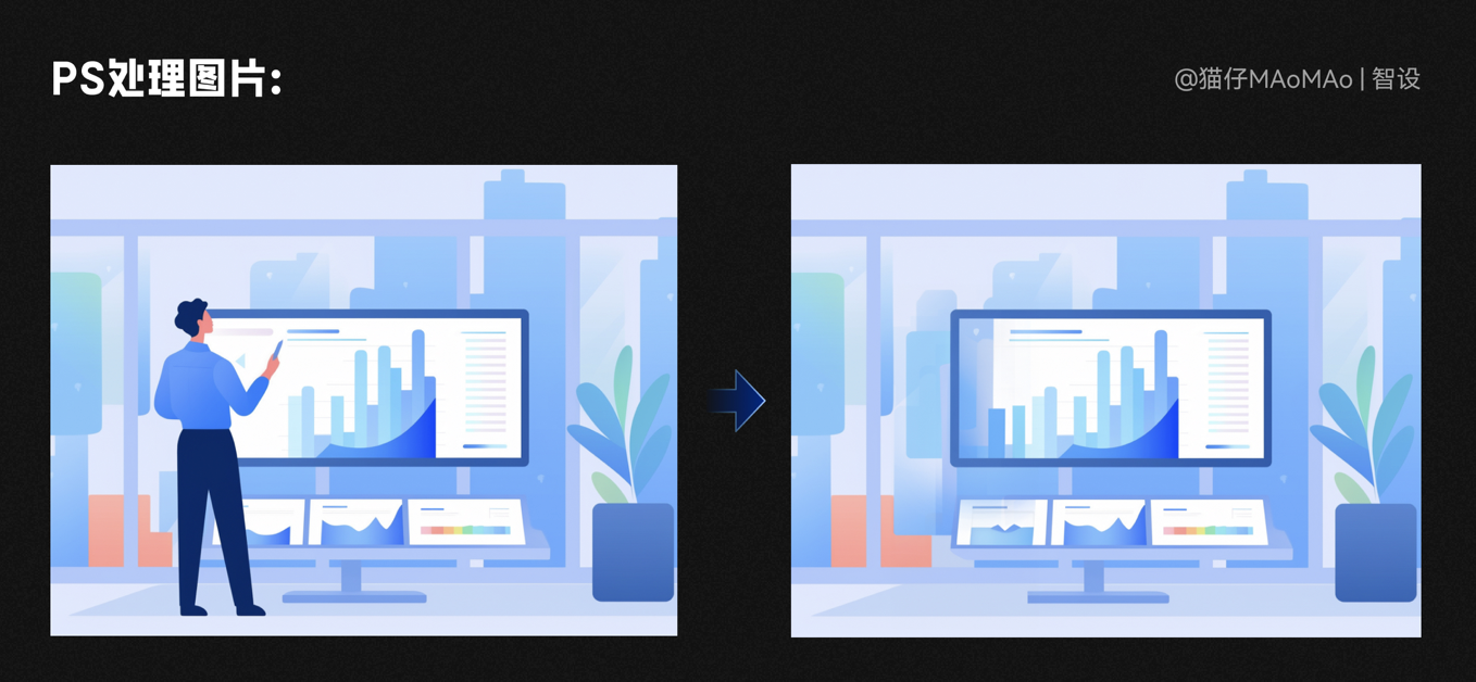 生成的素材我們需要先用 PS 處理一下,背景素材需要處理的地方:主視覺多余的部分需要?jiǎng)h掉、色調(diào)處理、圖片比例修改。
