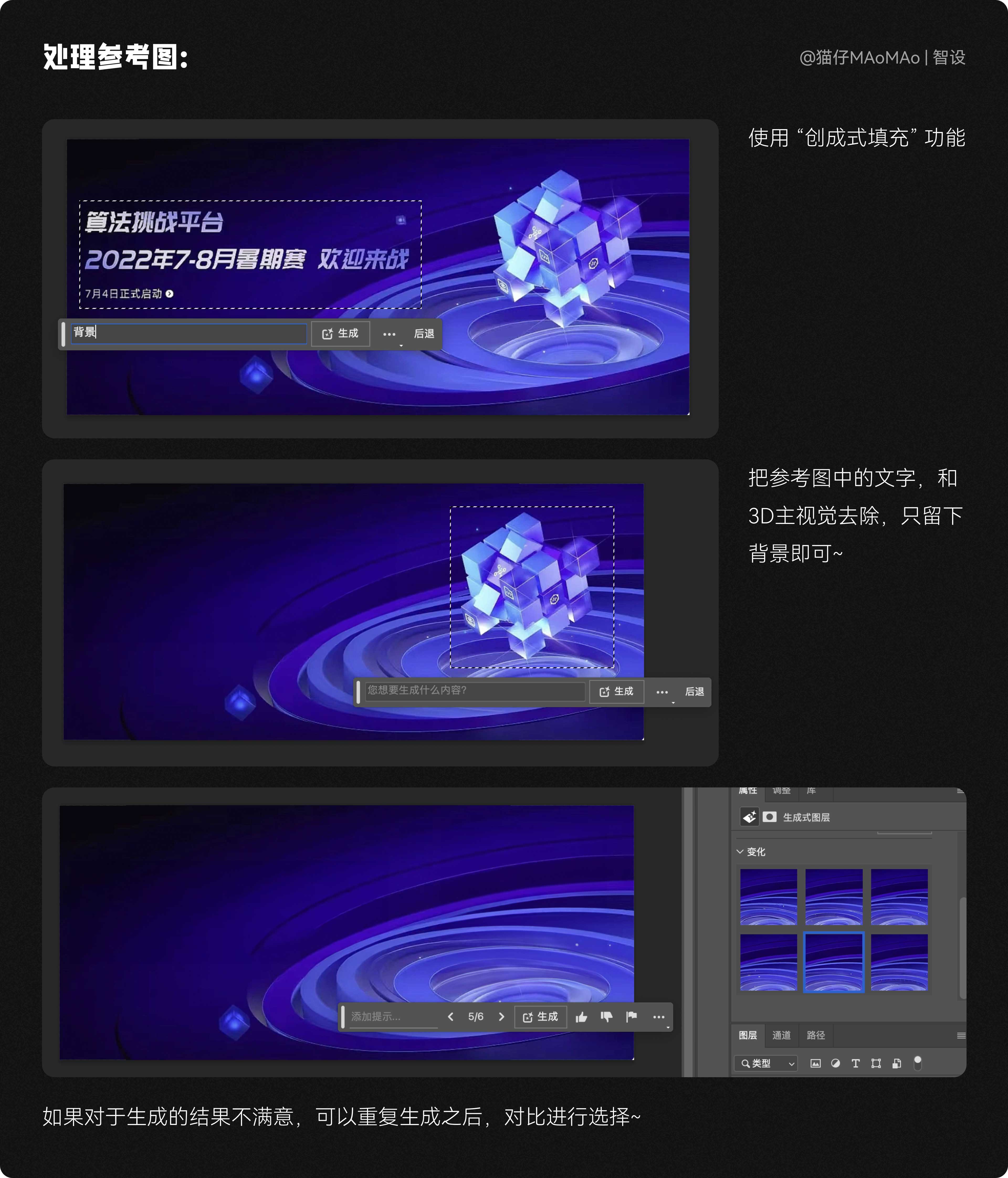 盡管AI現(xiàn)在可以輔助我們進(jìn)行設(shè)計(jì),但設(shè)計(jì)師的審美和基本功仍然至關(guān)重要,在輸出核心素材時(shí),我們需要通過不斷微調(diào)細(xì)節(jié),從大量素材中精挑細(xì)選出最合適的那一個(gè),最終得到我們需要的背景素材圖。