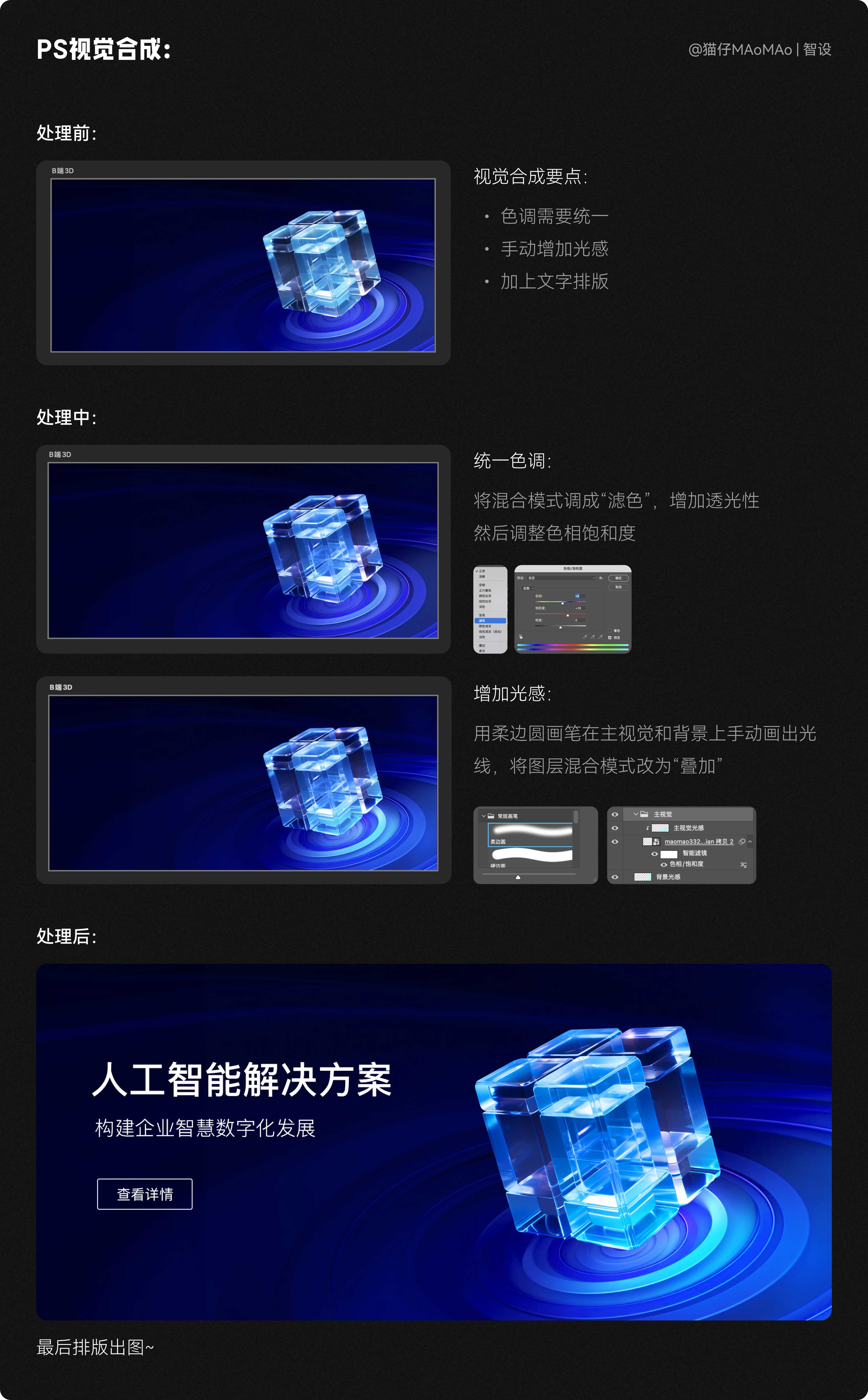 這一步考驗(yàn)的是設(shè)計(jì)師的審美和手活,我們需要把背景和主視覺素材,進(jìn)行視覺合成,其實(shí)也非常簡單:這里我定的主要色調(diào)是藍(lán)色+青色的光感,首先需要將色調(diào)整體統(tǒng)一;然后想要表現(xiàn)出玻璃質(zhì)感的通透,我們需要加上一些光感;最后文字排版出圖即可~