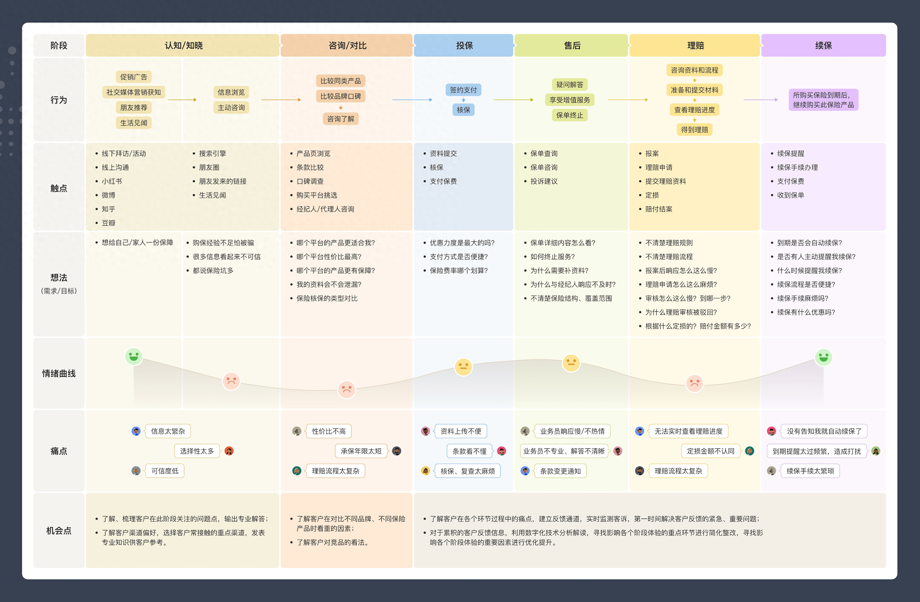 用戶旅程圖的應(yīng)用廣泛,不僅可以幫助我們進(jìn)行流程分析,還可以識(shí)別痛點(diǎn),定義問題域。同時(shí),它也可以幫助我們進(jìn)行用戶反饋的收集和整理,為產(chǎn)品或服務(wù)的優(yōu)化提供依據(jù)。然而,用戶旅程圖并不是一種一次性的工具。它需要我們不斷地更新和完善,以適應(yīng)不斷變化的市場(chǎng)和用戶需求。因此,即使我們所屬的團(tuán)隊(duì)沒有特別完善,也許我們?cè)诤荛L(zhǎng)時(shí)間內(nèi)都沒有運(yùn)用的環(huán)境,但是不要忘記,它依然是一個(gè)威力無比的工具。