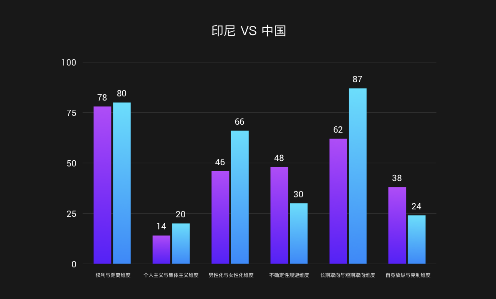 在設(shè)計(jì)前期,我們需要先對(duì)目標(biāo)用戶的文化差異進(jìn)行分析,解讀出印尼文化和中國文化的差異與共性。下面引用 hofstede 的六個(gè)文化維度理論去構(gòu)建文化場景。