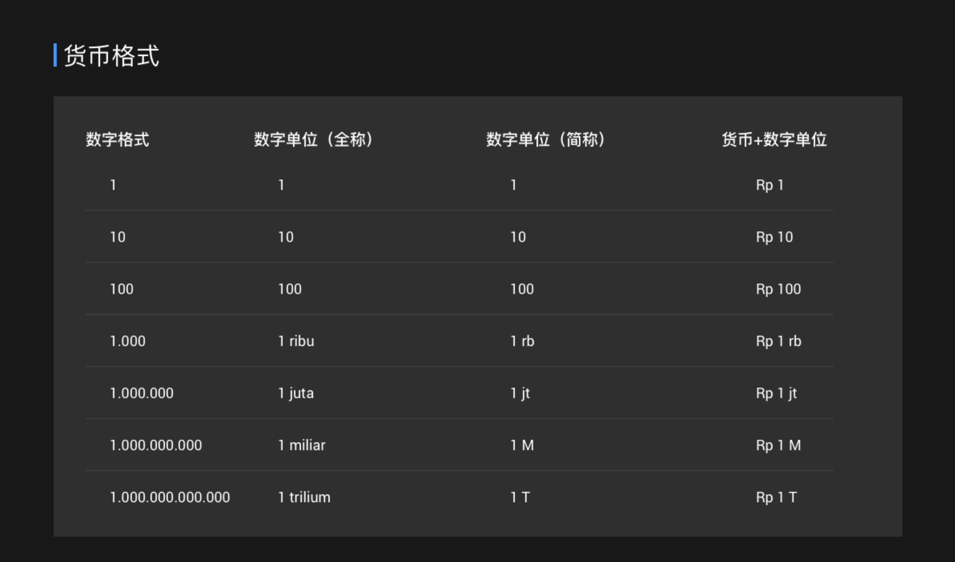 印尼的貨幣符號(hào)是 Rp,貨幣名稱是 IDR ( 印度尼西亞盧比)。 在印尼,表示千位的寫法有兩種,Rp2.000 或者是 Rp2 rb ( rb 是 ribu 的縮寫 ), 但是 Rp2.000 的用法更多些。印尼沒有萬的概念,對(duì)于大額的數(shù)字,在正式場景中,比如商品標(biāo)價(jià)或銀行的收據(jù),都會(huì)將金額全部展示出來,不會(huì)使用縮寫。只有在非正式場合,例如需要快速吸引人眼球的新聞標(biāo)題或海報(bào)中才會(huì)出現(xiàn)。