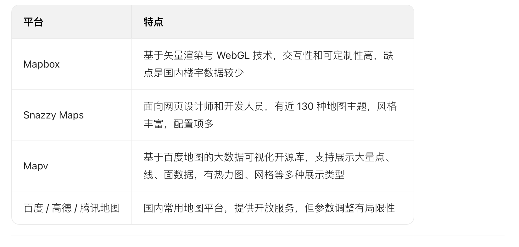 • 技術(shù)能力:可制作 2D、3D 矢量、邊界、瓦片地圖,支持交互、漫游(如點(diǎn)擊下鉆到區(qū)縣),可添加飛線層、氣泡層、熱力層等多層數(shù)據(jù)并設(shè)置不同效果。