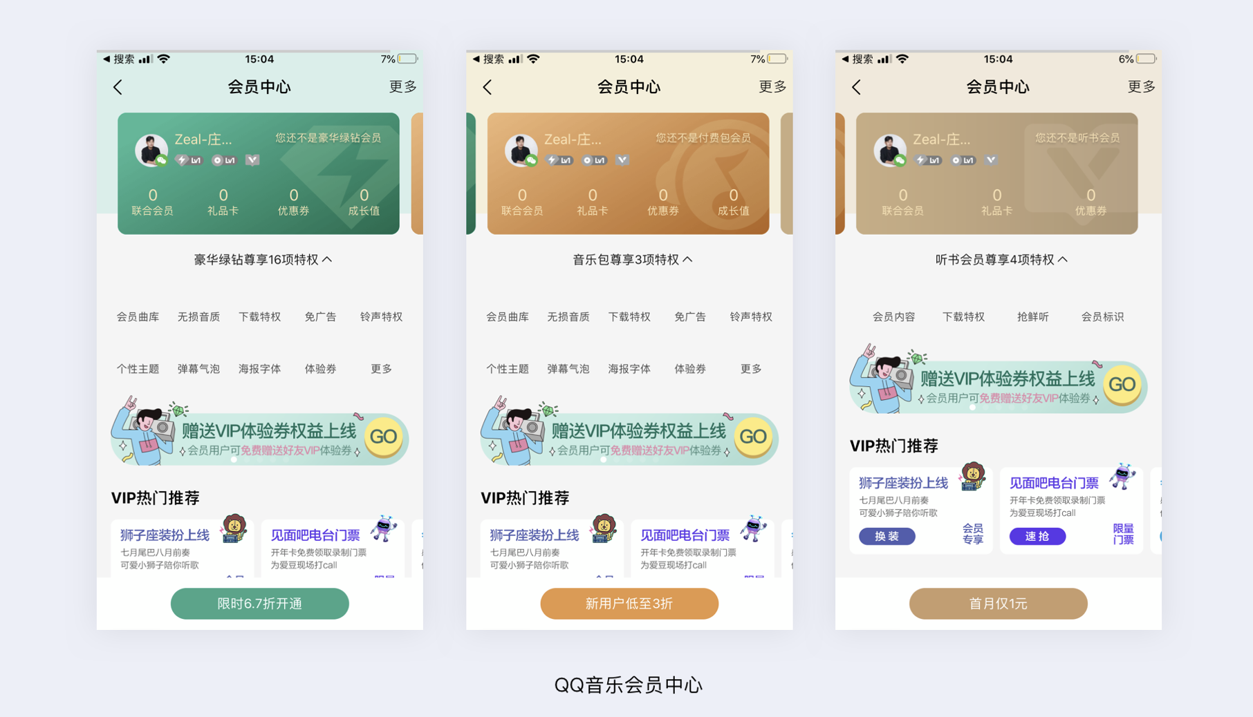 - 圖版率與視覺比重:通過顏色填充背景改變界面專屬比重,引導視覺,如 QQ 音樂會員中心不同等級對應不同顏色 card。