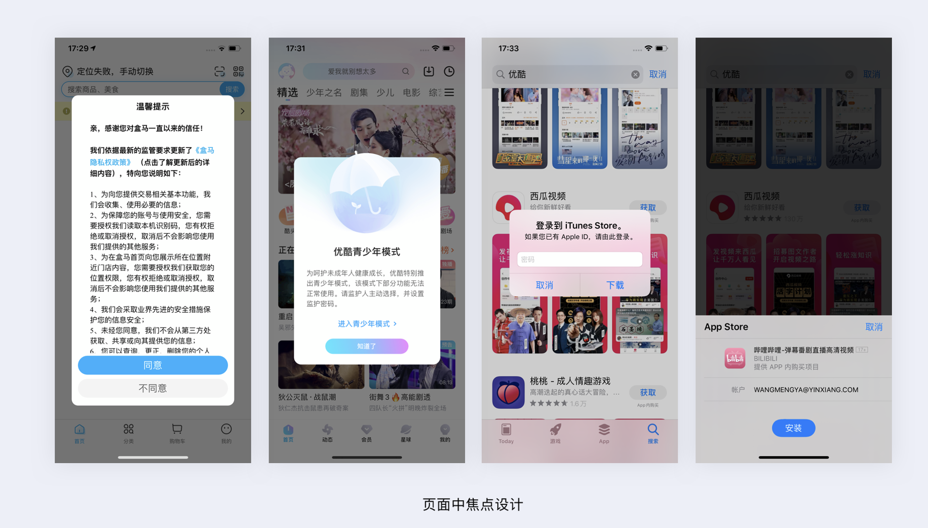 - 頁面焦點:采用模態(tài)彈窗等不可忽視的方式,如盒馬隱私政策彈窗。