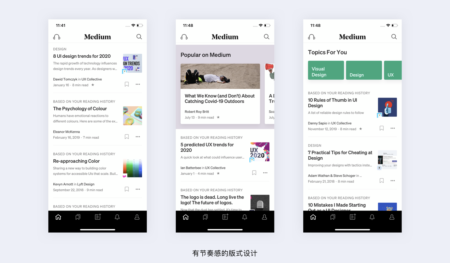 - 節(jié)奏感設計:在統(tǒng)一樣式中穿插不同模塊,如 Medium、網(wǎng)易云音樂的版式設計。