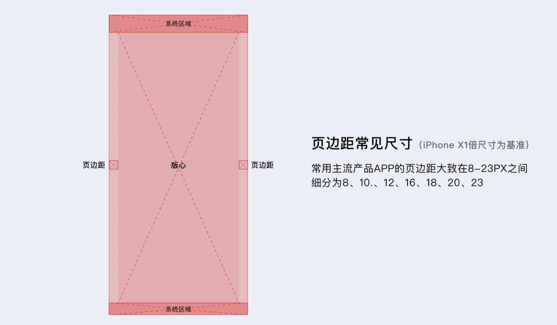 - 版心邊距:常用尺寸 8-23PX(以 iPhone X1 倍尺寸為基準),內(nèi)容多的文字類和購物類產(chǎn)品邊距較小,圖片、視頻類產(chǎn)品邊距較大。