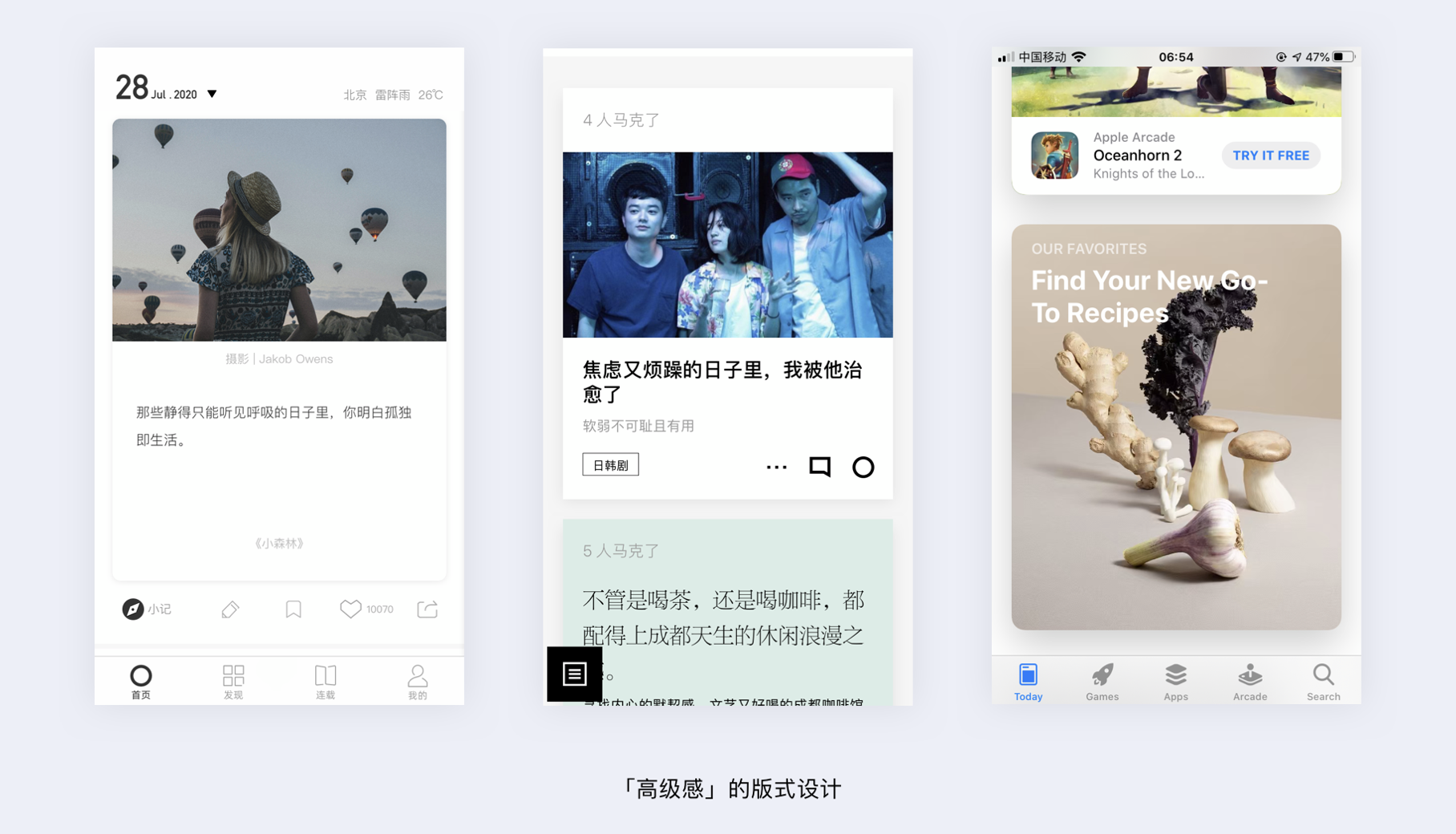 - 高級感版式:利用大留白、大卡片、高品質(zhì)圖片,如 Apple Arcade 界面。