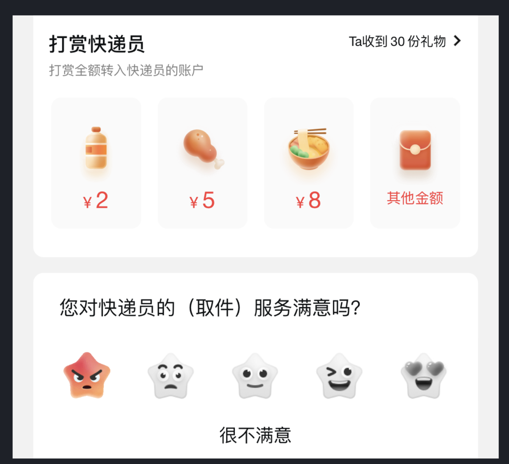 順豐速運(yùn)在用戶完成快遞服務(wù)后,通過(guò)打賞功能和滿意度評(píng)價(jià)環(huán)節(jié),用直觀的表情圖標(biāo)體現(xiàn)不同滿意度等級(jí)(很不滿意、不滿意、一般、滿意、非常滿意),并搭配具體評(píng)價(jià)選項(xiàng),既形象傳遞信息,又提升了用戶參與度。