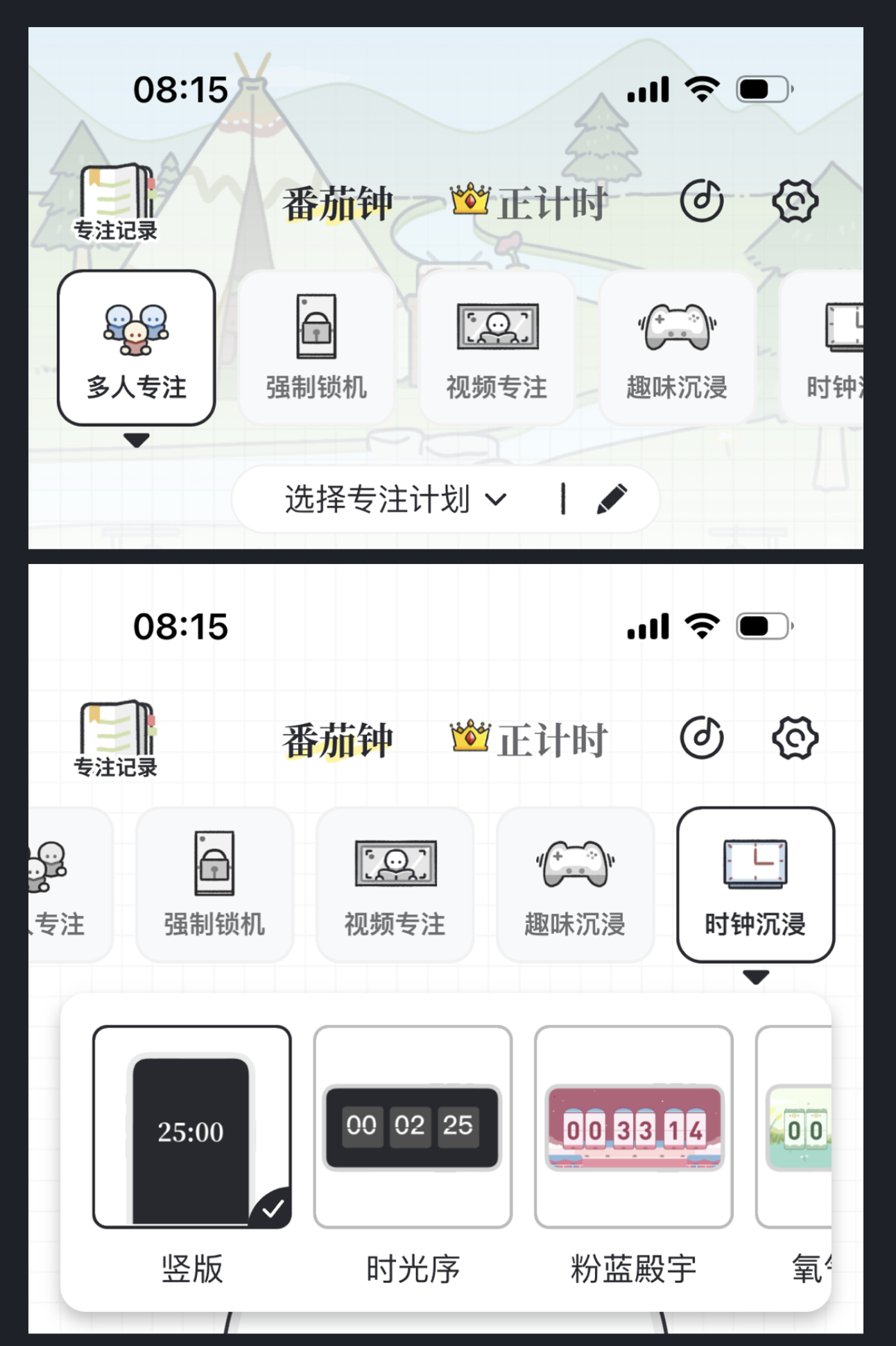 “我要做計(jì)劃” App 的 “專注” 欄目采用懸浮式主題篩選,用戶可選擇登山、海底探險(xiǎn)等主題,直觀的樣式讓設(shè)置操作更清晰,提升了感官和體驗(yàn)感。