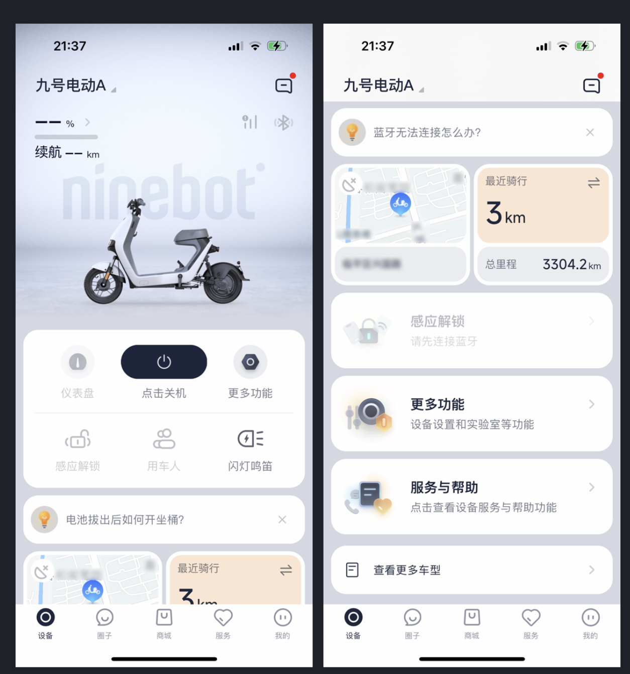九號(hào)出行 App 體現(xiàn)了 Bento UI 設(shè)計(jì)趨勢(shì),界面如便當(dāng)盒般有清晰區(qū)塊劃分,功能區(qū)分明確,整體整齊美觀,富有層次感、現(xiàn)代感。