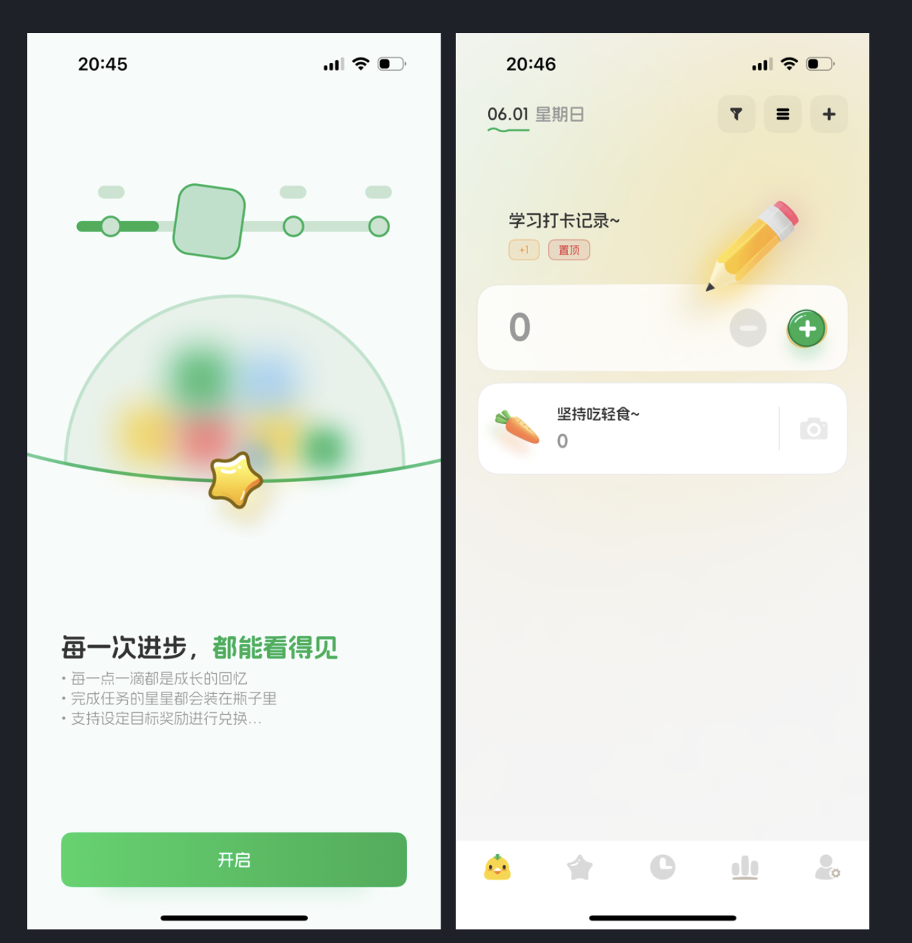 “星習(xí)慣” App 集習(xí)慣養(yǎng)成、學(xué)習(xí)打卡、生活記錄等功能于一體,其 UI 設(shè)計(jì)區(qū)別于大眾化風(fēng)格,符合年輕用戶審美,交互邏輯也值得學(xué)習(xí),用戶可通過(guò)完成任務(wù)收集 “星星”,還能設(shè)置目標(biāo)獎(jiǎng)勵(lì)等。