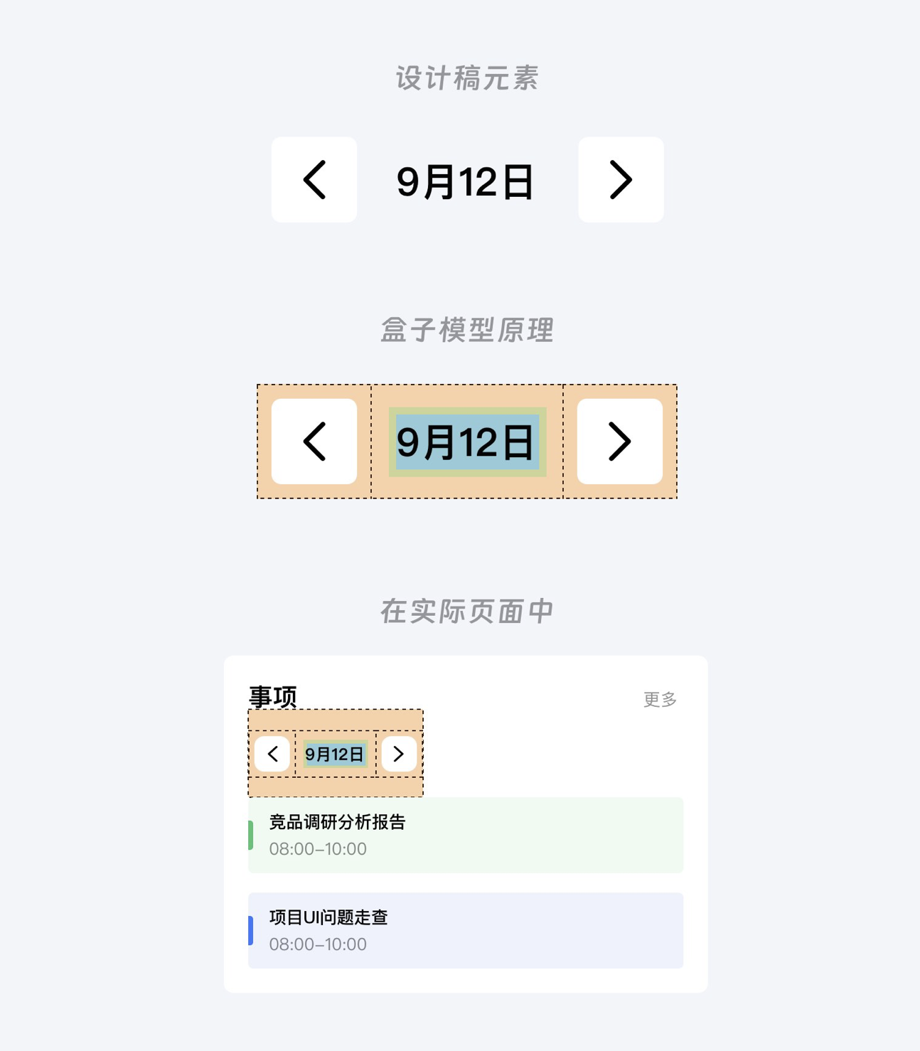 • 案例實操:以 “9 月 12 日” 的日程元素為例,其內(nèi)容(如事項名稱、時間)對應(yīng) content,內(nèi)容與邊框的距離為 padding,元素邊框為 border,與其他元素的間距為 margin。通過調(diào)整這些屬性,可讓元素按設(shè)計稿布局整齊排列。