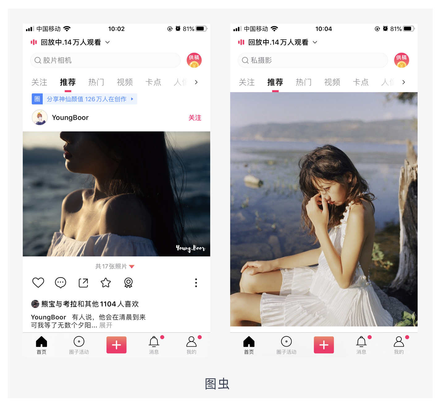 - 隨圖片而變化:當(dāng)用戶上傳不同比例的圖片時(shí),圖片展示寬度為屏幕寬度,展示高度根據(jù)確定的寬度等比例縮放。這種適配方式能將圖片信息表達(dá)完善,但圖片占用空間大,適合圖片質(zhì)量高、用戶以瀏覽圖片為主的產(chǎn)品,如圖蟲(chóng)。不過(guò)需要注意的是,采用該方式需要設(shè)置最大最小閾值,當(dāng)圖片的高度超過(guò)一定數(shù)值,高度就不再增加,當(dāng)圖片的高度小于一定數(shù)值,高度不再減小。