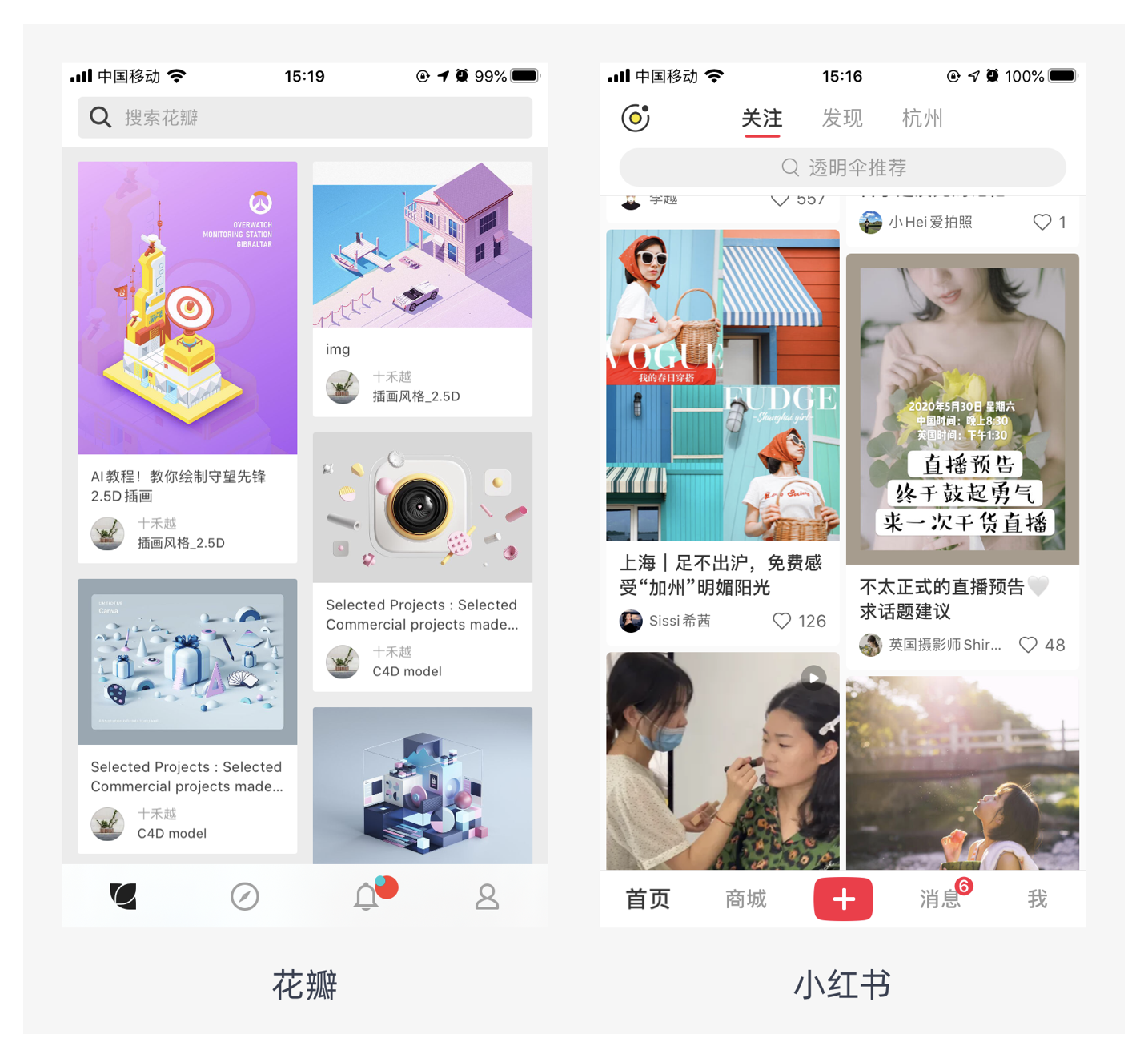 瀑布流式布局的視覺(jué)表現(xiàn)為參差不齊的多欄布局,用戶的視線軌跡以 Z 型為主,這種軌跡易于閱讀。但由于用戶采用 “就近原則” 閱讀信息,容易產(chǎn)生漏讀現(xiàn)象。它適用于社區(qū)類瀏覽型頁(yè)面,這類頁(yè)面往往信息量大,采用瀑布流式布局能讓瀏覽體驗(yàn)更為流暢,如花瓣、小紅書(shū)等平臺(tái),用戶可以不斷下拉獲取更多內(nèi)容,沉浸在瀏覽過(guò)程中。