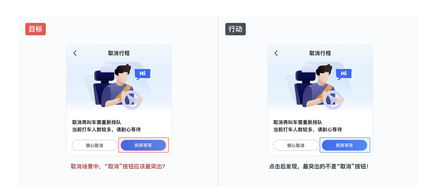 比如看到 APP 里一個顯眼的紅色按鈕,以為是 “返回”,點(diǎn)擊后卻發(fā)現(xiàn)是 “提交訂單”;在打車軟件里,把 “狠心取消” 當(dāng)成 “查看詳情”。這種錯誤源于 “規(guī)劃階段”,是界面信息混亂、層級不清晰導(dǎo)致的 —— 用戶不是手滑,是被設(shè)計 “誤導(dǎo)” 了。