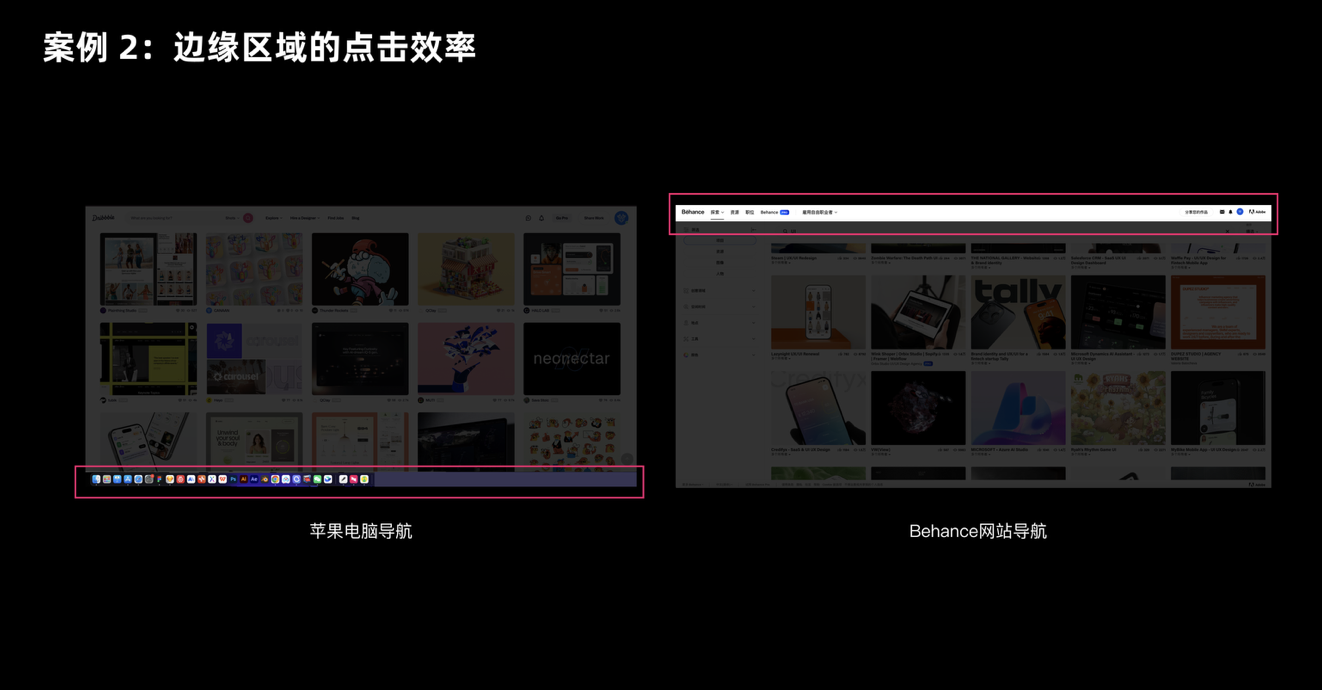 屏幕邊緣是被很多設計師忽略的 “黃金區(qū)域”—— 因為邊緣能擋住手指或鼠標的移動,相當于給目標加了 “天然邊界”,用戶不用刻意控制精度就能快速定位。這就是為什么 Mac 的 Dock 欄、Windows 的任務欄都放在屏幕底部或側(cè)邊,而不是中間。