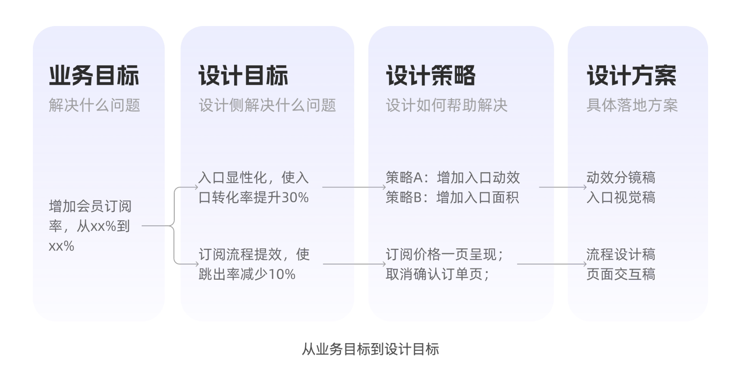 設(shè)計(jì)目標(biāo)必須是 “設(shè)計(jì)側(cè)能獨(dú)立影響、可量化” 的指標(biāo)。比如從 “提升訂閱率” 拆解出兩個(gè)設(shè)計(jì)目標(biāo):“會(huì)員入口點(diǎn)擊率提升 30%”“訂閱流程跳出率降低 20%”,這兩個(gè)指標(biāo)能直接通過設(shè)計(jì)優(yōu)化實(shí)現(xiàn),也便于后續(xù)評(píng)估設(shè)計(jì)價(jià)值。