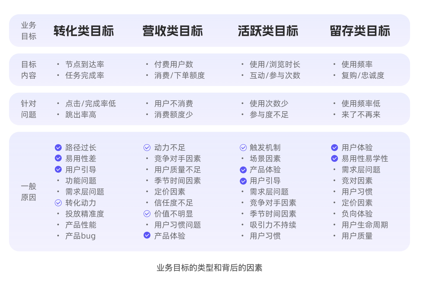 先判斷業(yè)務(wù)目標(biāo)屬于哪一類,再定位核心痛點(diǎn)。四大類業(yè)務(wù)目標(biāo)的核心問題的如下: