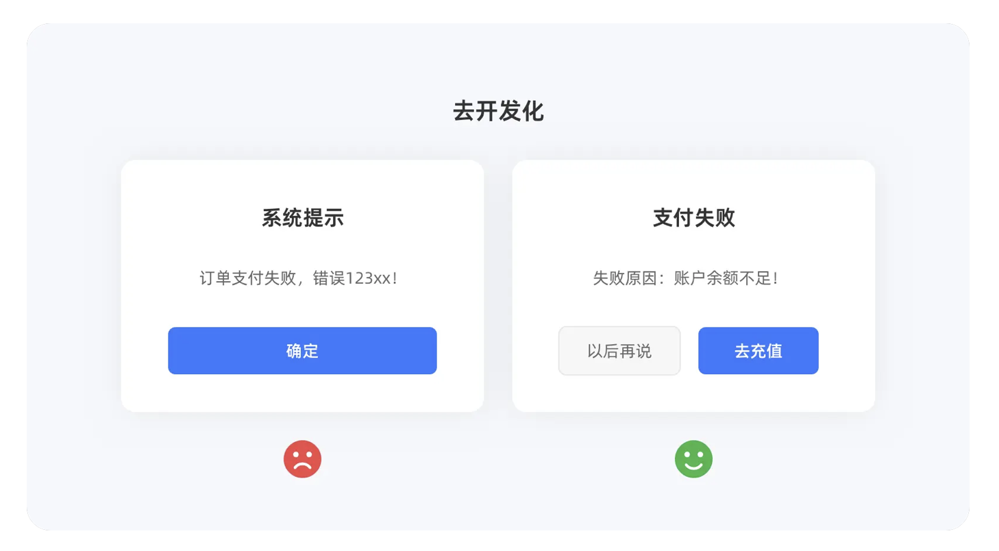 • 拒絕負(fù)面詞匯:避開(kāi) “不要”“不能”“失敗” 等詞匯,用正向表達(dá)替代,“暫未找到結(jié)果” 比 “沒(méi)有符合條件的內(nèi)容” 更溫和。