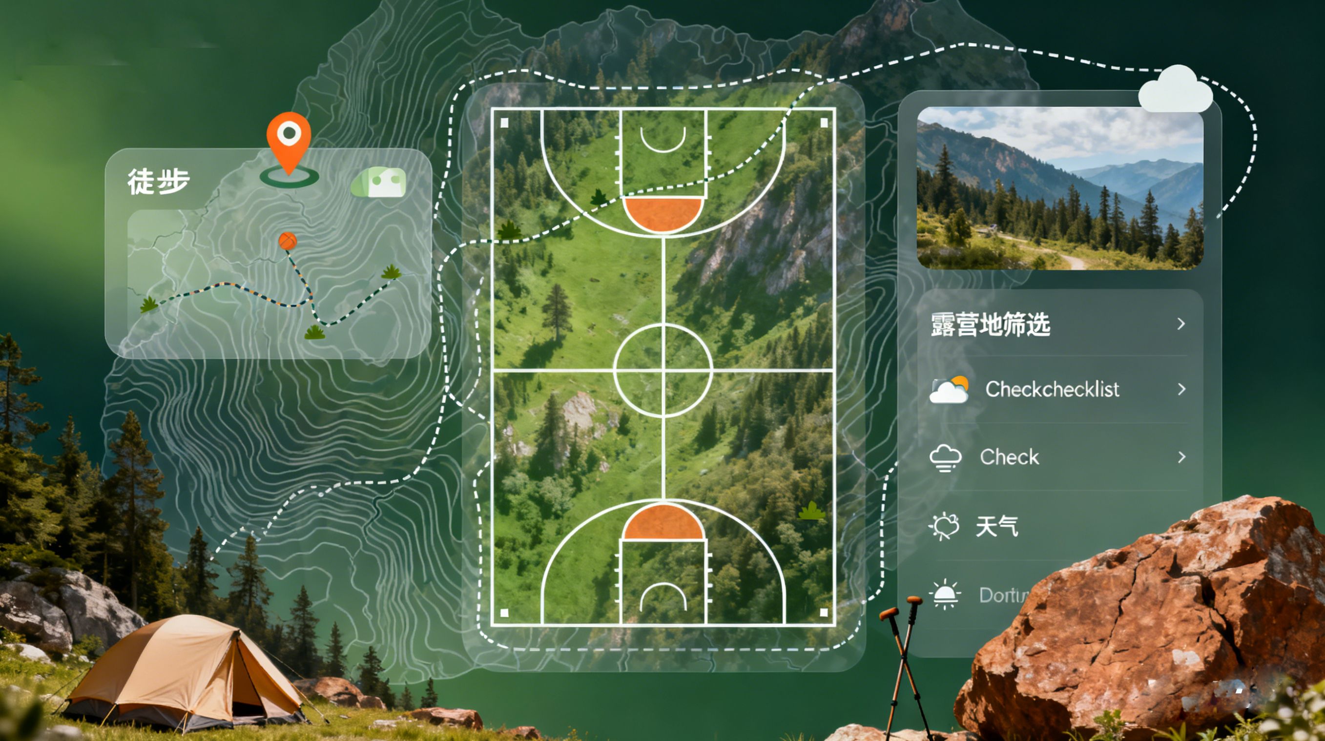 (注:圖中展示了旅游類 APP 的場景化設(shè)計(jì),背景融入地圖元素,功能模塊貼合出行場景)