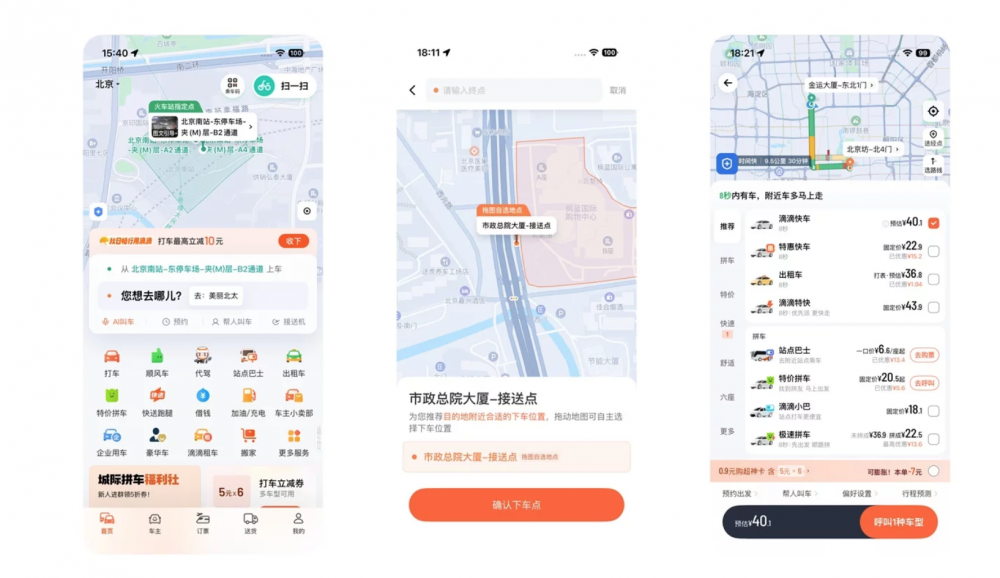 滴滴國內(nèi)版的首頁同樣可劃分為五大功能區(qū)域,但在功能優(yōu)先級與信息承載度上與國際產(chǎn)品差異顯著。核心區(qū)域除地圖展示、地址填寫等基本需求外,還融入了上車點(diǎn)實(shí)景圖等魅力需求,提升用戶體驗;其他功能區(qū)則整合了 AI 叫車、預(yù)約、代叫、接送機(jī)等叫車衍生服務(wù),以及順風(fēng)車、代駕、站點(diǎn)巴士、出租車等多元出行選項。