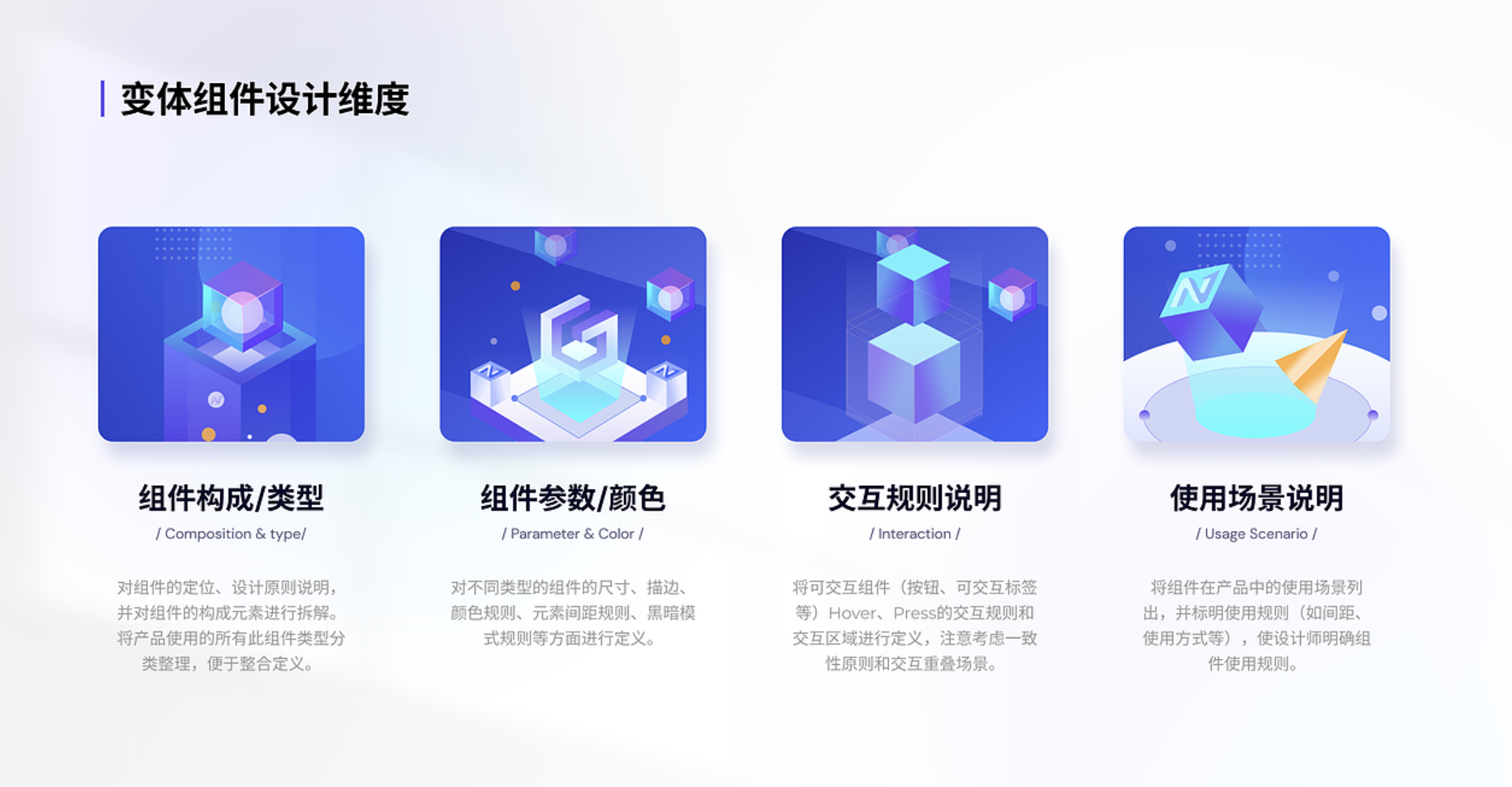 參數(shù)規(guī)范是變體組件落地的關(guān)鍵,需從尺寸、顏色、間距、交互等維度制定明確標(biāo)準(zhǔn),確保設(shè)計一致性與可執(zhí)行性。