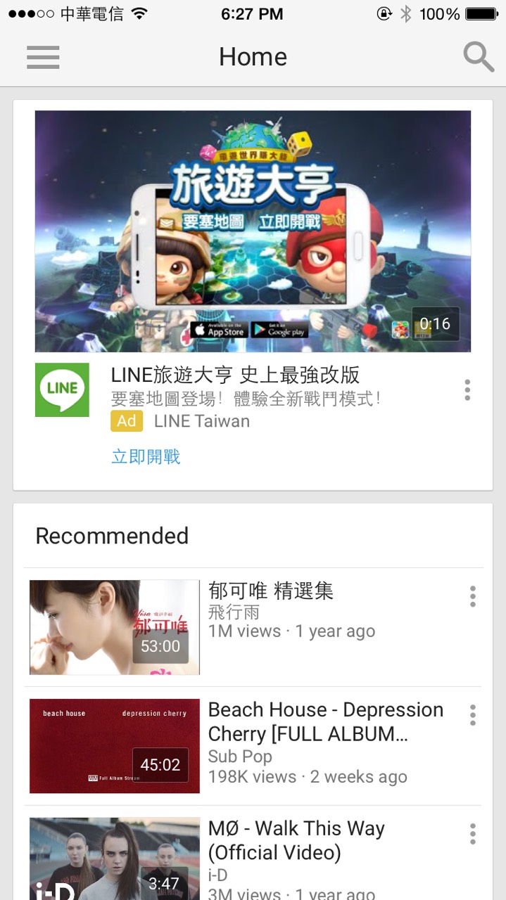 例如 YouTube 應(yīng)用一點(diǎn)開(kāi),你就知道這個(gè)應(yīng)用的基礎(chǔ)內(nèi)容是什麼了。下面有推薦的內(nèi)容,第一欄的 Home bar 則有明顯的查詢(xún)標(biāo)識(shí),讓用戶(hù)可以馬上開(kāi)始查他想看的影片。