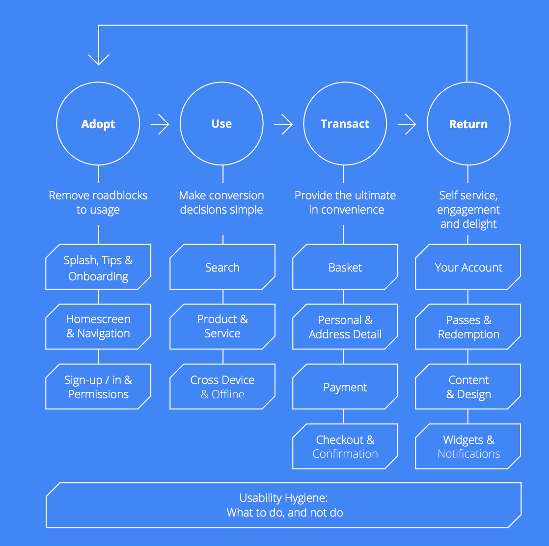 以下是應(yīng)用設(shè)計(jì)時(shí)的四個(gè)步驟:適應(yīng)、使用、交易、回流