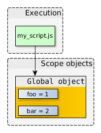 在上面的代碼中,我們有一個執(zhí)行的上下文(myscript.js自身的代碼),以及它所引用的作用域?qū)ο?。全局對象里面還含有很多不同的屬性,在這里我們就忽略掉了。