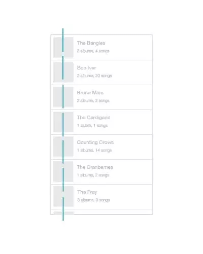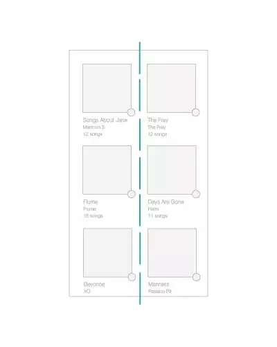 軸最常見于對稱元素的使用,當(dāng)元素被布置成軸對稱的布局的時候,會給人有序感。就像生活中絕大多數(shù)的事情一樣,我們更傾向于享受有序的的東西,它們令人感覺平穩(wěn)、舒適、平易近人。最簡單的一個例子就是iTunes 程序中的專輯列表的設(shè)計,所有的專輯列表在界面的左側(cè)保持對齊,圍繞虛線軸軸對稱。