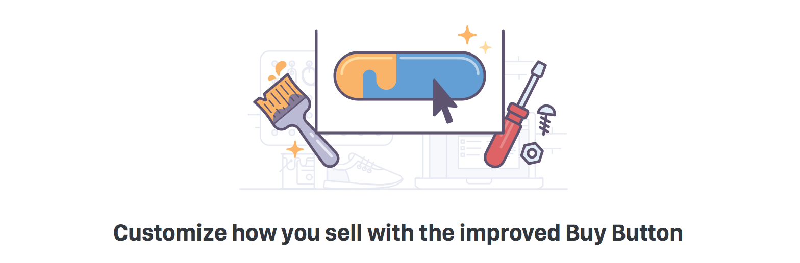 這個(gè)元素與那個(gè)元素融合,就能表達(dá)我們想要傳遞的內(nèi)容??赡苓@類比喻使用起來需要更老道的經(jīng)驗(yàn),但在產(chǎn)品插畫里的確更受重視,或者說一般設(shè)計(jì)都會(huì)考慮它,因?yàn)樗亲層脩臬@知你的產(chǎn)品或功能賣點(diǎn)的捷徑。如下圖所示,沒錯(cuò),你知道我們提供了“購(gòu)買”的按鈕,但瞧瞧旁邊擺放的畫筆,基于對(duì)畫筆的了解,你就會(huì)明白你能定制“購(gòu)買”按鈕的顏色。將刷子的功能與按鈕的功能混合起來,刷子可以自定義顏色,因此我們的按鈕也可以。與品牌和營(yíng)銷設(shè)計(jì)一樣,這種比喻在圖標(biāo)設(shè)計(jì)中也時(shí)常出現(xiàn)。