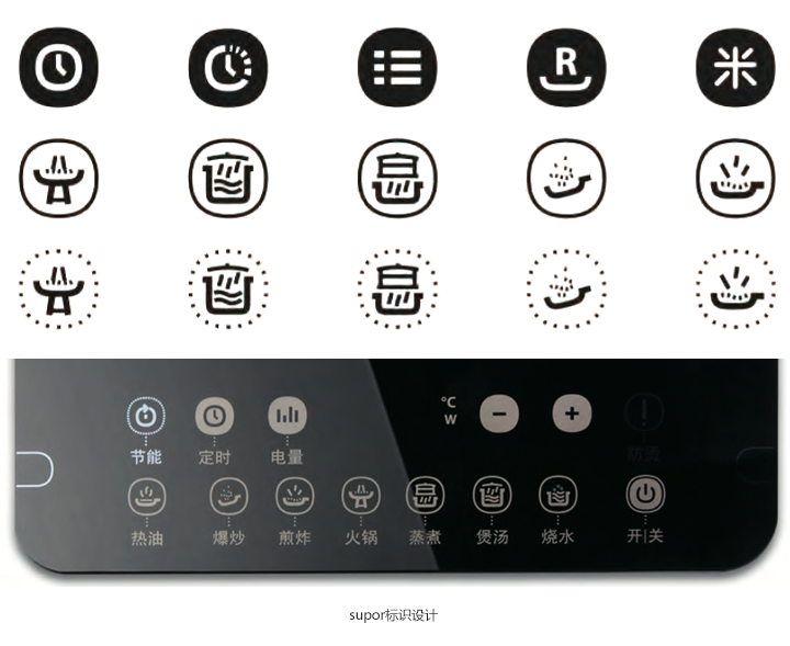 蘇泊爾標(biāo)識(shí)系統(tǒng)吸收了米字格和“永字八法”,將所有圖標(biāo)元素看作是漢字的八個(gè)筆畫,運(yùn)用八個(gè)筆畫元素按照“米字格”的網(wǎng)格系統(tǒng)再組合,設(shè)計(jì)出蘇泊爾標(biāo)識(shí)系統(tǒng)的所有標(biāo)識(shí)。