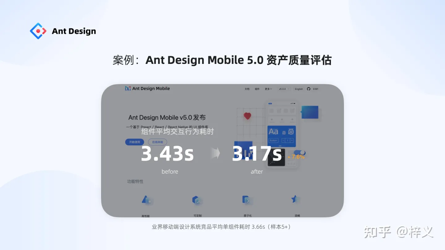 在螞蟻內部,我們還將原規(guī)范應用到其它設計系統(tǒng)的建設當中。比如,Ant Design Mobile 5.0 今年引來大版本的更新,從 200+ 的冗余組件收斂成了 68 個通用組件,同時通過評估發(fā)現(xiàn)其組件質量也提升了不少,系統(tǒng)中單組件平均交互行為耗時從 3.42 降到了 3.17,高于業(yè)界平均。